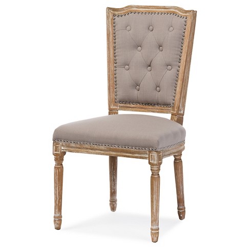 Estelle Chic Rustic French Country Cottage Weathered Oak Beige Fabric Button Tufted Upholstered Dining Chair Baxton Studio