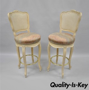 Details About Vtg French Country Louis Xv Style Cane Back Swivel Bar Stools Chairs Wood A Pair